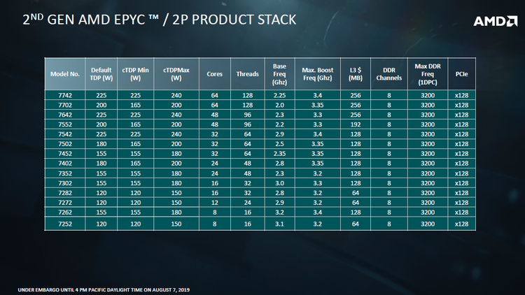 The second-generation processors are headlined by the EPYC 7742, which comes with 64 cores, 128 threads, a base frequency of 2.25 gigahertz, a max boost frequency of 3.4 gigahertz, an L3 cache of 256 megabytes. The CPU's default thermal design power is 225 watts, and it can go up to 250 watts.
