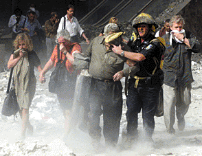 Rescue workers help victims of the terrorist attack shortly following the collapse of the Twin Towers last week. Thousands are feared dead.