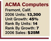 ACMA, which saw its unit sales jump 45 percent in 2006, ramped up its deployment of systems integrated with VMWare for virtualization solutions. In doing so, the company hit a hot spot in the market for server consolidation solutions. About three-quarters of the 13,300 units it sold last year were servers.
