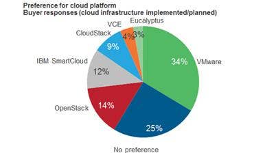 Following VMware in popularity were OpenStack, the open-source platform pioneered by Rackspace, at 14 percent; IBM's SmartCloud platform at 12 percent; the Citrix CloudStack platform at 9 percent; VCE, the joint venture between Cisco and EMC with funding from Intel and VMware, at 4 percent; and Eucalyptus at 3 percent.