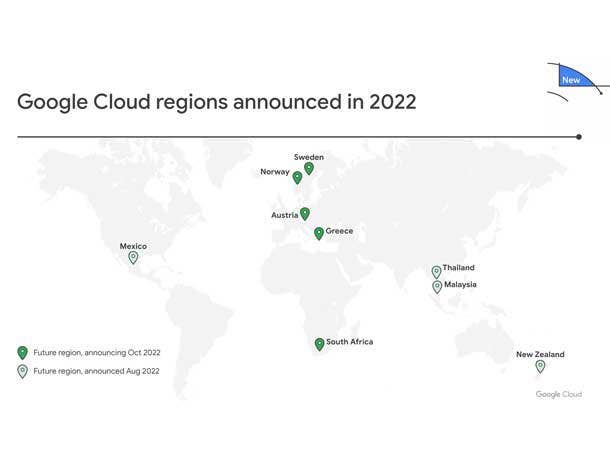 The company unveiled plans at Google Cloud Next to build new cloud regions in six counties: Austria, Czech Republic, Greece, Norway, South Africa, and Sweden.
