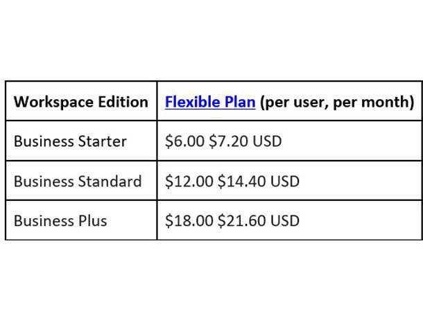 For Workspace Business Plus, the Flexible Plan price is now $21.60 per user, per month, up from $18.