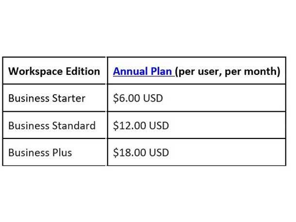 For Workspace Business Standard, the Annual Plan price is $12 per user, per month.