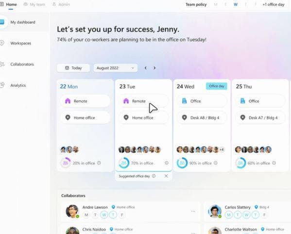 You don‘t just, say, show up for a meeting. You show up for purpose and connection. So we are building a new system to help you create a place, including tools to help you see when your colleagues are planning to come in, what meetings are best suited to be in person and reserve the right place for you. And for leaders, we provide recommendations on how to transform your space into a place.