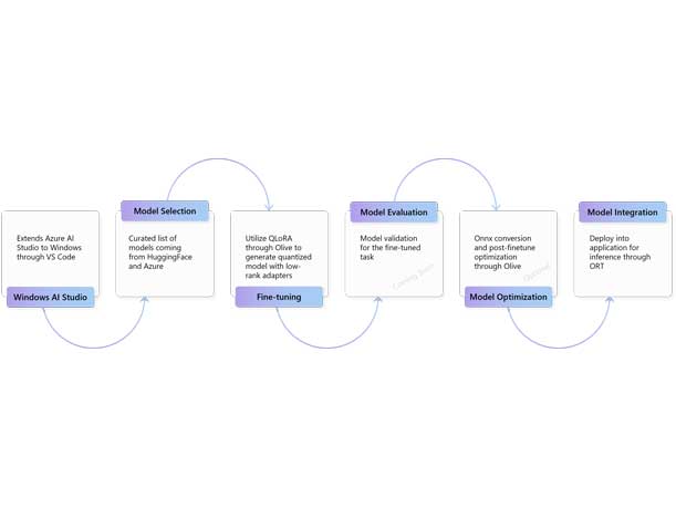 Developers can test fine-tuned models with Prompt Flow and Gradio templates integrated into the workspace. They can run models on the cloud on Azure, on the edge locally on Windows or across the two.
