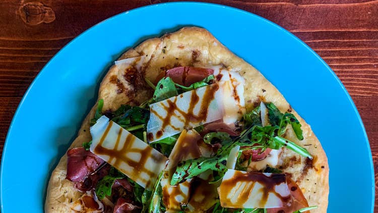 While pizza is baking mix arugula with olive oil, lemon juice, salt, and pepper (to taste, no measurements required).