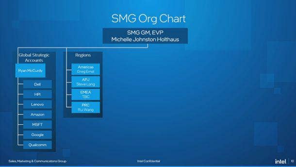 As for other changes, Johnston Holthaus said Intel’s new Customer and Sales Excellence team, led by Becky Brown, will join her staff.