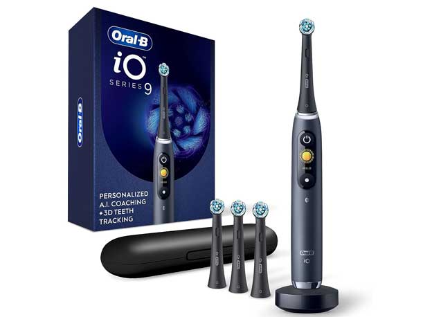 Oral-B’s iO Series 9 electric toothbrush promises more plaque removal than a manual brush, according to a listing. AI-powered position detection technology tracks the user’s brush placement across all three teeth surfaces. This Amazon listing also includes three replacement brush heads.