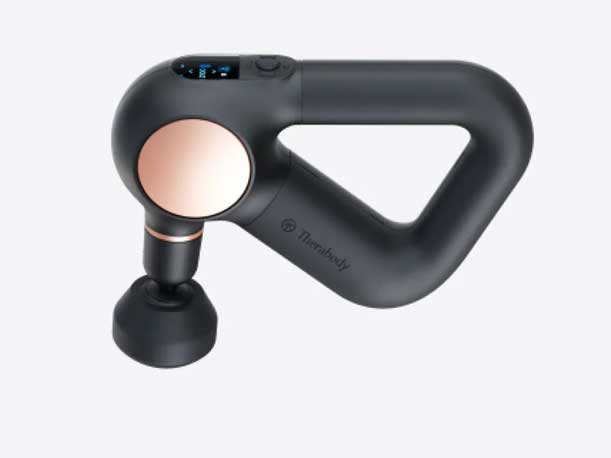 A built-on biometric sensor has on-device heart rate readings, according to an online listing. The gun works with a Therabody application to save visually guided routines for users. The gun also has five speeds managed through its digital screen.
