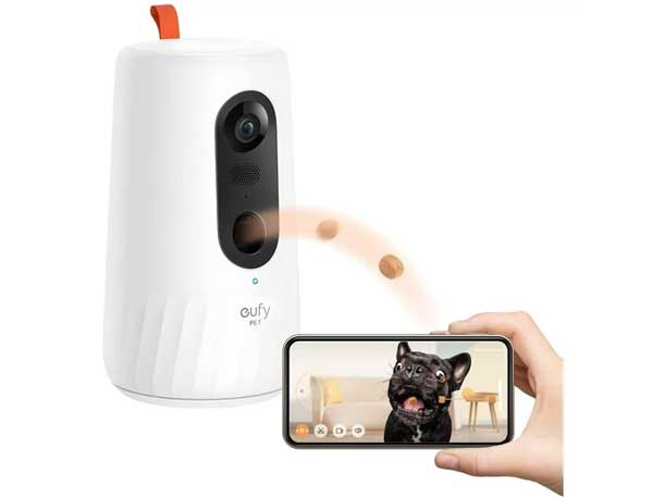 The device has a 1080p wide-angle lens with 2.5 times zoom, according to an online listing. It has night vision, two-way audio communication and three-distance remote treat tossing.