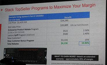 Frey showed how a combination of up-front discounts, rebates, spifs, and new customer bonus could result in a 19.9 percent margin on a sale of 10 x86 servers.