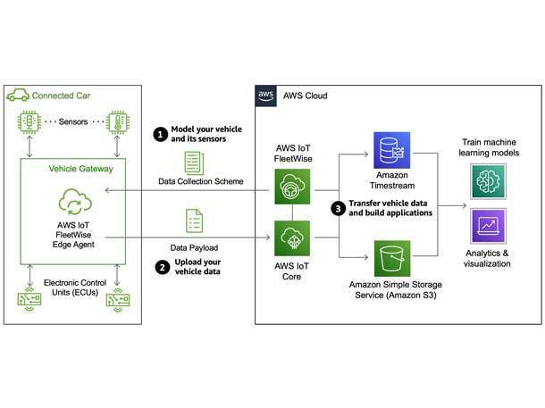 AWS IoT FleetWise helps customers collect, transform, and transfer vehicle data to the cloud in near real time. New insights gained can allow companies to quickly identify potential maintenance issues, make systems smarter, or use analytics and machine learning to improve autonomous driving.