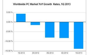 The figures are tough for PC makers, but also for Microsoft, which saw its Windows 8 launch not only fail to provide a positive boost to the PC market but also serve as the impetus behind market slowdown, according to Bob O'Donnell, IDC program vice president for clients and displays.