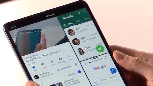 The Galaxy Fold also stands out from other smartphones by offering the use of three apps at a time on the 7.3-inch Infinity Flex Display. Samsung demonstrated the use of three-app multitasking with apps including YouTube, WhatsApp and web browsing.