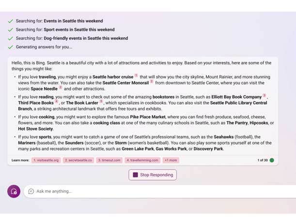 In an example, using a highly general prompt about what to do for the weekend, the AI features took into account earlier questions about her dog to suggest pet friendly activities that were near her.