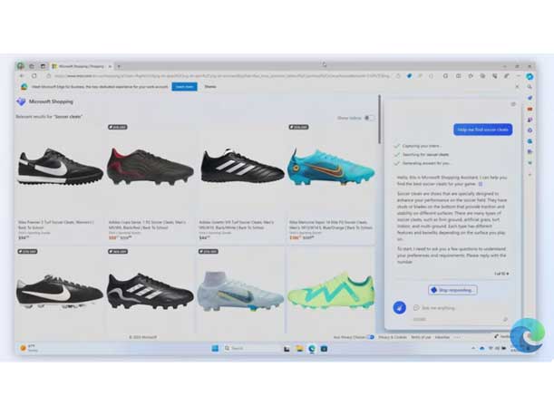 “My nephew loves playing soccer and I want to get him some new cleats. I’m not an expert so Copilot in Microsoft shopping will guide me to find the best pair by asking smart questions like his skill level, which is not something I would have thought to consider. Next it asks me to choose the type of field he’ll be playing on. I can even compare my options of top name brands from thousands of online merchants. I can get summarized reviews including the pros and cons of the shoe and co pilot gets me to a recommendation.”
