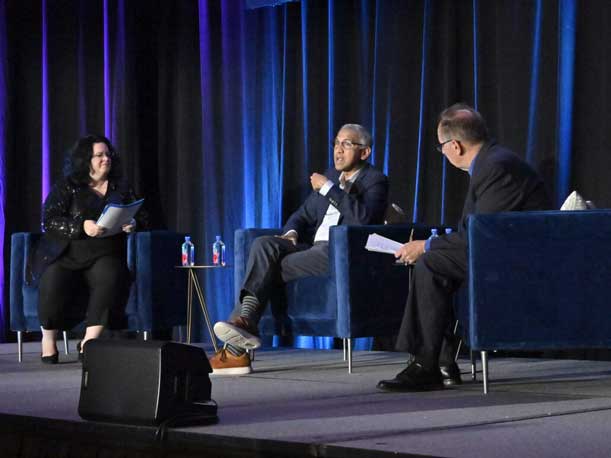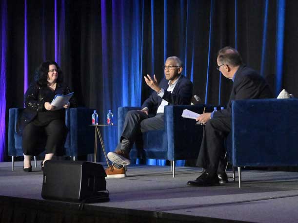 (From L-R) CRN Executive Editor Jennifer Follett, Nutanix CEO Rajiv Ramaswami, CRN Editor News Steven Burke