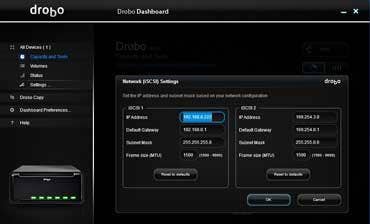 Drobo's administrative tool is called Drobo Dashboard, and is by far the best iSCSI software we've seen as far as ease of setup. Included for Mac OS X (Intel only) and Windows, this tool is only really needed for initially configuring network settings, creating and modifying volumes and for taking basic snapshots. Drive formatting choices include NTFS, multi-host and none; NTFS, HFS+ and FAT32 file systems are supported (EXT3 is in beta). Capacity is selected with a slider in 2TB increments, which explanations of the impact of each choice (for example, selecting 16TB might cause Windows to take a long time to start up). Thin provisioning is hard wired, and permits volumes to be created in excess of physical capacity.