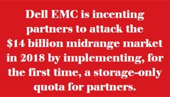 Dell EMC is counting on channel partners, who account for about 70 percent of Dell’s midrange storage business, to drive the share gains. The company is incenting partners to attack the $14 billion midrange market in 2018 by implementing, for the first time, a storage-only quota for partners. In the past, Dell had a combined storage and server quota, but that’s no longer the case.