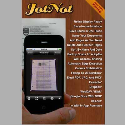JotNot for iOS is like a pocket-sized copy machine. It turns an iPad, iPhone or iPod Touch into a document camera for easy storage, sharing and distribution of papers, receipts and general documents, and even whiteboards. Thanks to integration with other iOS apps, pictures can be printed, shared or OCR'd.