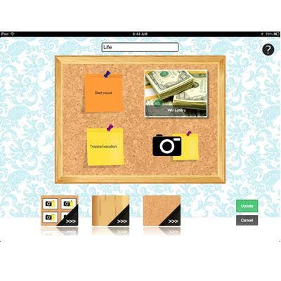 Visionboard is a digital cork board for organizing life's goals. Sticky-note reminders and goal-tracking photos and postcards that you can pin to the cork board can contain notes that let you update and track progress.