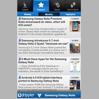 Drippler searches for news, tips, rumors and software updates about the device on which it's installed and sorts its tasty tidbits by "latest" news, stories, reviews, rumors and info, and those it deems "popular."