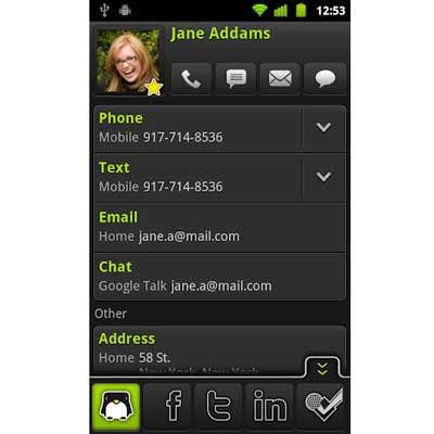 Contapps' Contacts for Android brings phone info and recent exchanges in Facebook, LinkedIn, SMS and Twitter to a single screen for all your contacts. It also can replace Android's default dialer and messaging clients.