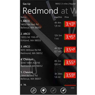 Gas Up Free for Windows Phone 7 displays gas prices of all grades (plus diesel) with station names, addresses, maps and directions, plus control over sorting favorites, custom searches and price alerts.