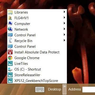 For die-hard Start menu purists, there's a way to bring up what we're calling a Start Menu Lite. To enable it, go to Desktop mode and right-click (or long-press) on the taskbar. When the Toolbars menu appears, select "Desktop" to display the Desktop toolbar shown. Other handy Toolbars available include the on-screen keyboard and address bar for quick URL entries.