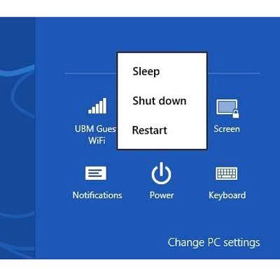 The controls to restart and shutdown a system are now found in the lower portion of the Charms bar (shown), which remains consistent regardless of which app is active. These quick settings include wireless network, sound, screen resolution, notifications on-screen keyboard and system power. For the first time in Windows history, it's no longer necessary to go to the "Start" menu to stop a system.