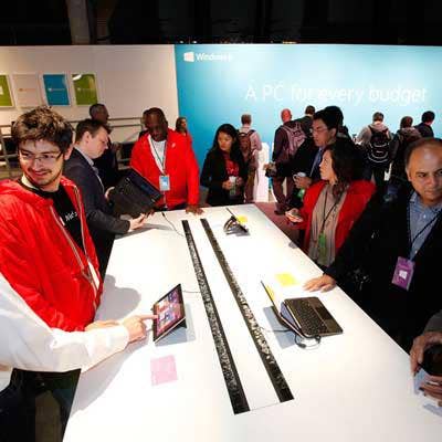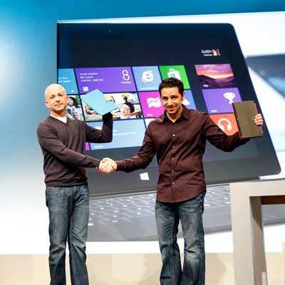 Sinofsky and Panos Panay (right), general manager for Microsoft Surface, demonstrated the tablet's capabilities and, in an effort to prove its durability, dropped it on the floor several times and then showed off a Surface tablet with skateboard wheels attached that Sinofsky stood on.