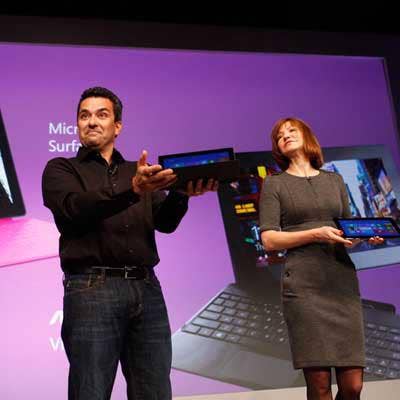 Mike Angiulo, corporate vice president of Windows Hardware and PC Ecosystem at Microsoft, and Julie Larson-Green, Microsoft's corporate vice president of program management for Windows, demonstrated some of the new capabilities in Windows 8 and Windows RT, the latter shown running on Microsoft's new Surface for Windows RT tablet.