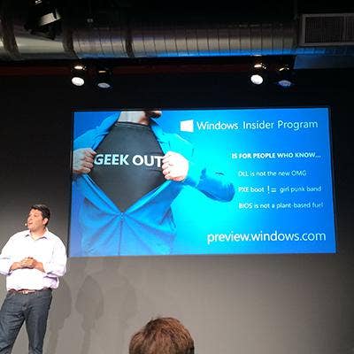 The Windows Insider program is for people who "know that DLL is not the new OMG; that PXE boot ! = girl punk band; and hat BIOS is not a plant-based fuel," according to this slide. OK then.