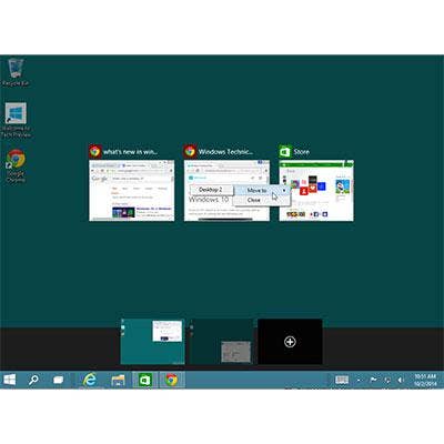 Windows 10 now provides multiple desktops in which to launch apps and open files, an obvious nod to Mac OS X. To get there, a new Task View mode is activated by a button on the Taskbar or by swiping in from the left. Eerily like Mac OS X's Mission Control, Task View displays shrunken versions of all running apps across the center of the screen and a row of desktop thumbnails across the bottom (Apple's appear at the top). Clicking on an image brings up that app or desktop. As in Apple's Dock, running apps are highlighted in the Windows 10 Taskbar regardless of which desktop they're running in.