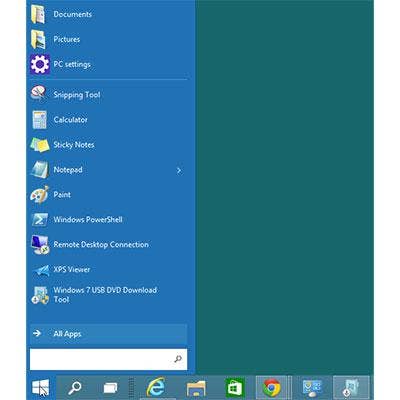 Yes, the Start Menu is back, and it's for real this time. It's shown here with a small version of the Windows-8-style Start Screen and its Live Tiles glued onto the side. More on the Tiles section later. At the left side starting from the top is the current user's login ID and the system power button (for sleep, restart or shutdown). Below that is a list of recently used apps that's populated by Windows based on user activity. Below that is a list of apps that can be populated by the user. When a small arrow appears next to an app in either section, clicking on it brings up a list of local files recently opened by that app.