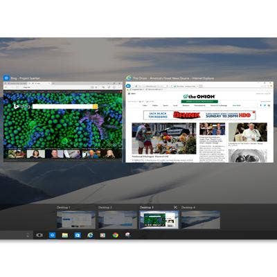 Another area of focus for Microsoft with Windows 10 is productivity. To that end, Microsoft has added to Windows 10 Virtual Desktops. These allow users to spread different projects across multiple virtual desktops. The "desktops" are essentially like having two monitors. One monitor (or virtual desktop) can have email, social media and instant messaging windows open and another desktop can have video editing software layouts, for example. With Windows 10, switching between desktops is a breeze.