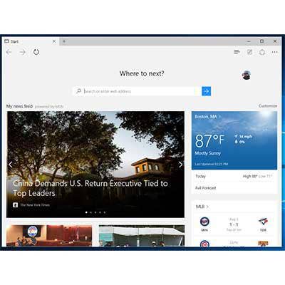 By default, the Edge browser opens up to a custom version of MSN.com as the start page. The MSN site is a simplified version of the full-blown MSN.com website. Gone from the top of the webpage are MSN navigation menus, headlines and distractions. Also gone is any Bing, MSN and Microsoft branding. The only thing that gives a hint it's a Microsoft-owned site is a small, grayed-out "powered by MSN" that's easy to miss.