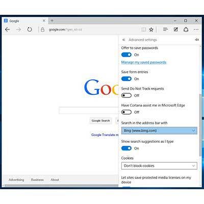 The default search engine dictates what search service is used when typing queries into the browser's URL bar. The default for Edge is Bing. If you want to change it to Google, Yahoo or Twitter, you’ll have to jump through some serious hoops. Instead of navigating Edge browser Settings and either entering a search engine URL or selecting from a predefined list of search providers, Microsoft makes you work to make changes.