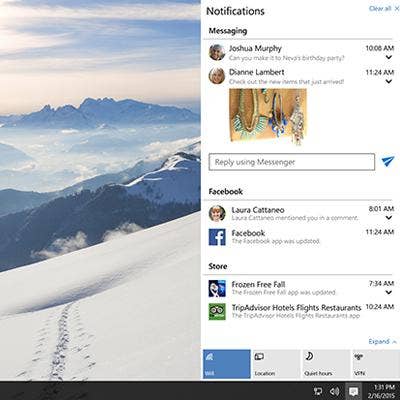 New in Windows 10 is a feature that centralizes notifications and common PC settings -- the Action Center, located at the bottom right corner of the desktop (the icon looks like a speech bubble). The Action Center aims to help with productivity but also cleans up the user interface a bit by replacing information bubble pop-ups on Windows. The Action Center is also customizable in Windows 10 settings.