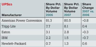The UPS industry has seen a lot of consolidation, but it's had little impact on the vendors' sales through distribution. APC, which last year was acquired by Schneider Electric, which also owns MGE, is by far the most commonly found UPS vendor in distribution. Its share of sales through distributors in 2007 is only slightly less than its share in 2006.Tripp Lite and Eaton, follow. Eaton also grew by acquisition last year when it acquired the low-end business of MGE from Schneider when the latter acquired APC.