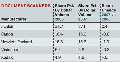 Fujitsu America dominated the market this year, with Canon and Hewlett-Packard jockeying for position. Said Scott Francis, senior director of product marketing at Fujitsu: "At Fujitsu we have a very core philosophy behind our document imaging scanners. They focus on three core things: the quality of the image that we capture, the paper handling itself and overall reliability so that the scanner simply will not break down."