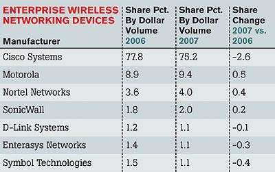 Cisco Systems continued its hold on the enterprise wireless networking market. No other vendor even came close, with Motorola, Nortel Networks, SonicWall and D-Link Systems rounding out the top five.