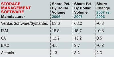 As data volumes grow, so grows the demand for software needed to manage the systems that store and back up all that data. Symantec, remained far and away the leader in this category, but that share represented a drop of 0.3 points from 2006.