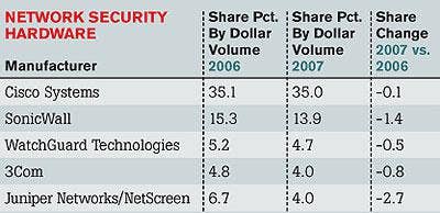 The story in channel-based network security hardware sales can be summed up in one word: flat. Cisco Systems held on to its roughly 35 percent share of the distribution market for the second half of 2007. But the best that can be said is that it lost slightly less share than its competitors, including SonicWall. With Cisco, WatchGuard Technologies and 3Com. dropping less than 1 percent in share, it's tempting to say the numbers are statistically insignificant. But add up distribution share losses by the top five vendors, and you wind up with about a 4.7 percent chunk of channel market ceded to smaller rivals. That's not a huge number, but it's significant. And solution providers like Matt Briese think they know why it's happening.