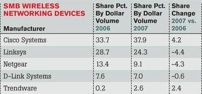 Where Cisco Systems dominates the enterprise wireless market, the networking giant is double-trouble in SMB. Cisco and the Cisco-owned Linksys Group last year were tops in SMB wireless market share and, separately, the pair also dominated. Despite this, other wireless networking vendors maintained a strong share of the market, with Netgear, D-Link Systems and Trendware in the mix.