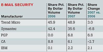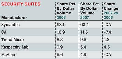 Symantec Corp. held fast to its position in security suite products, exceeding its nearest competitor, CA Inc., by more than 50 share percentage points. Despite its dominance, the company lost seven-tenths of a point in share from 2006 to 2007.