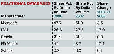 Data showing IBM's share declined comes as a surprise to Bernie Spang, director of data servers. Spang said a "significant volume" of IBM database software goes through distribution and indirect channels and sales grew significantly in 2007. The flat results for Oracle may be a bit disappointing given the mid-2007 launch of itsVAD Remarketer program, which seeks to increase sales of database products through distributors.