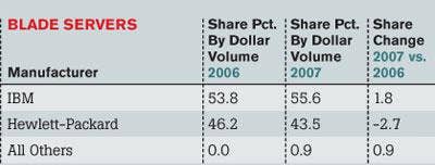 Competition remains fierce in blade servers, with perennial leaders IBM and Hewlett-Packard again topping the list. Alex Yost, IBM's vice president of the Blade Group, said he saw customers first begin to adopt blades about five years ago. "Customers were looking for servers that were more compact and integrated and could give them more computing power per square foot," he said. Now IBM is focusing on new offerings as its customers' needs have matured.