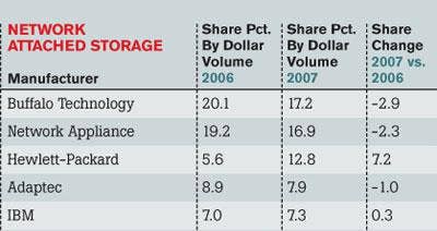 High sales volume has yet again put Buffalo Technology at the top of the NAS category,while higher sales prices kept Network Appliance and Hewlett-Packard in the top three.
