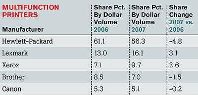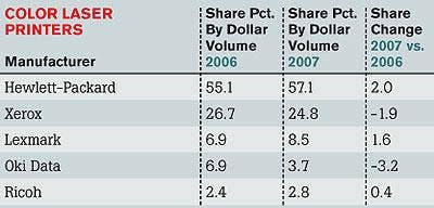 Hewlett-Packard continued its domination in the color printing segment, with Xerox, Lexmark International, Oki Data Americas and Ricoh in the mix as well. "Last year saw a slowdown a bit for all vendors in the category," said Gary Gillam, vice president, Xerox North American channel operations. MFPs took some of the market share in color laser printers. We're driving growth through the channel with more features and higher performance."